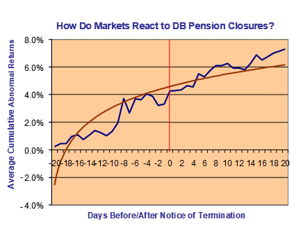 There is however an indirect way to answer this question and that is by examining the market’s reaction to changes in pension policy, or more specifically the announcement effect when companies shut-down or freeze their DB plan. Bear with me here for a moment since the results have some interesting implications to your clients – even if they are not large business owners themselves.
